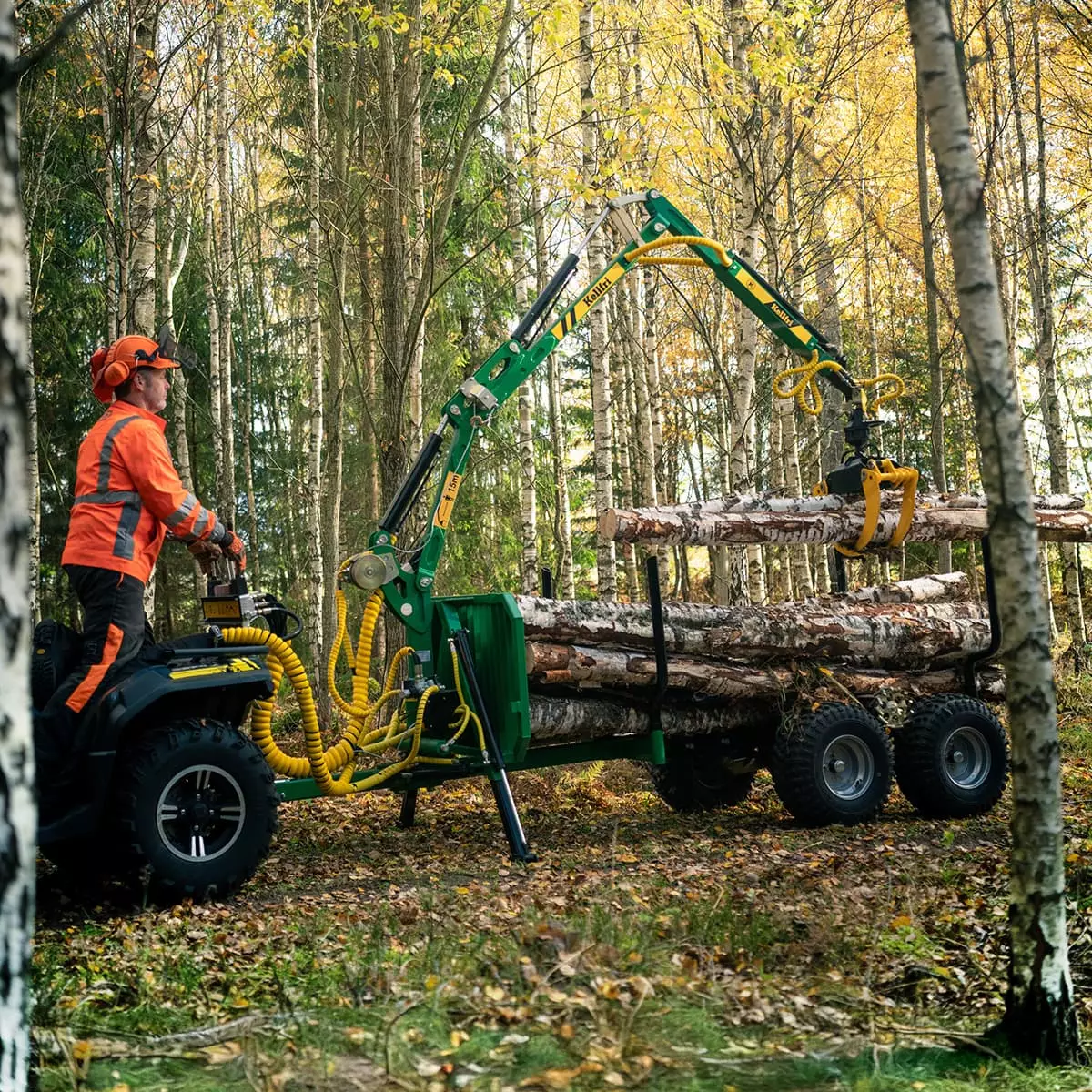 Kellfrin ATV-metsävaunu on rakennettu sinulle, joka haluat kuljettaa puutavaraa tehokkaasti myös ahtaissa ja haastavissa olosuhteissa. Vaunu yhdistää 2 000 kg maksimikuorman, 3,6 metrin nosturin sekä käytännölliset ominaisuudet kuten veto, nivelohjaus ja radio-ohjattu vinssi. Kokonaisuus on suunniteltu helpottamaan työskentelyä metsässä: nostat, vedät ja kuljetat hallitusti – säästäen sekä aikaa että kalustoa.